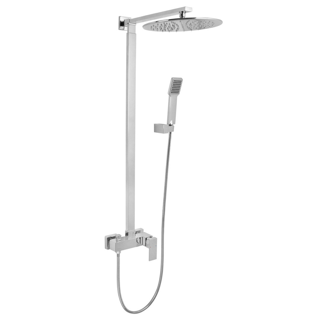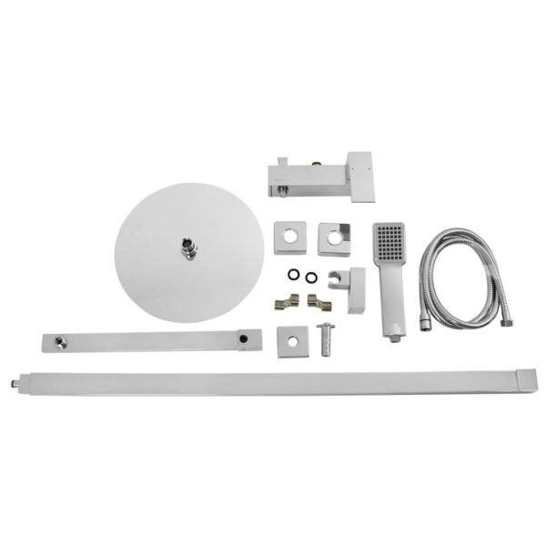 Lieferumfang: Duscharmatur, Regenbrausekopf, Rohrsystem, Handbrause, Brausehalterung, Brauseschlauch