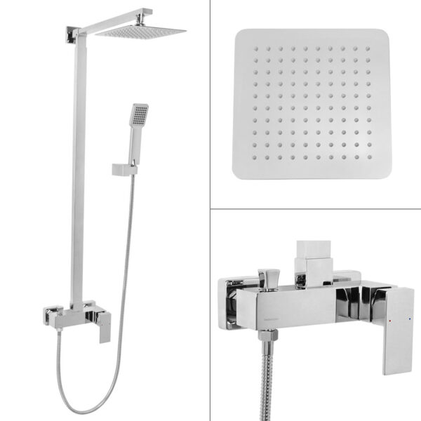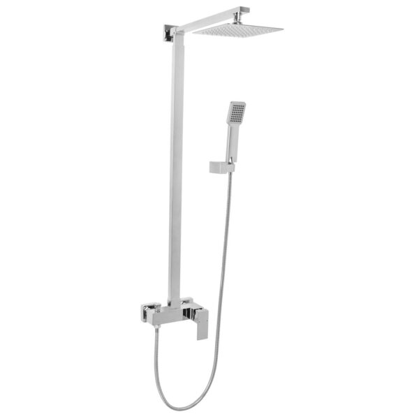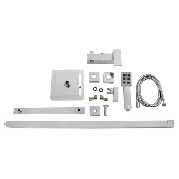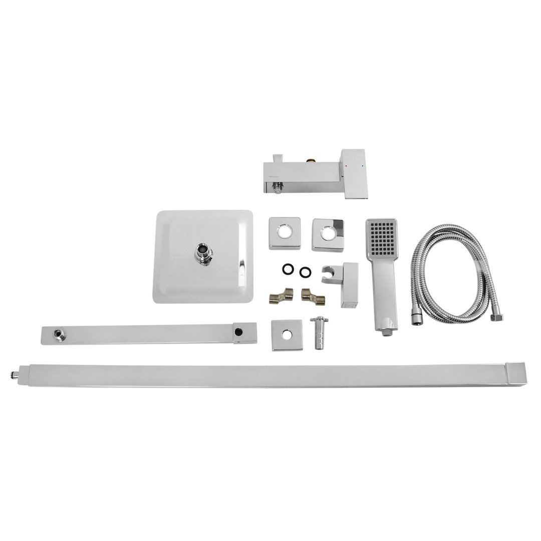 Lieferumfang: Duscharmatur, Regenbrausekopf, Rohrsystem, Handbrause, Brausehalterung, Brauseschlauch