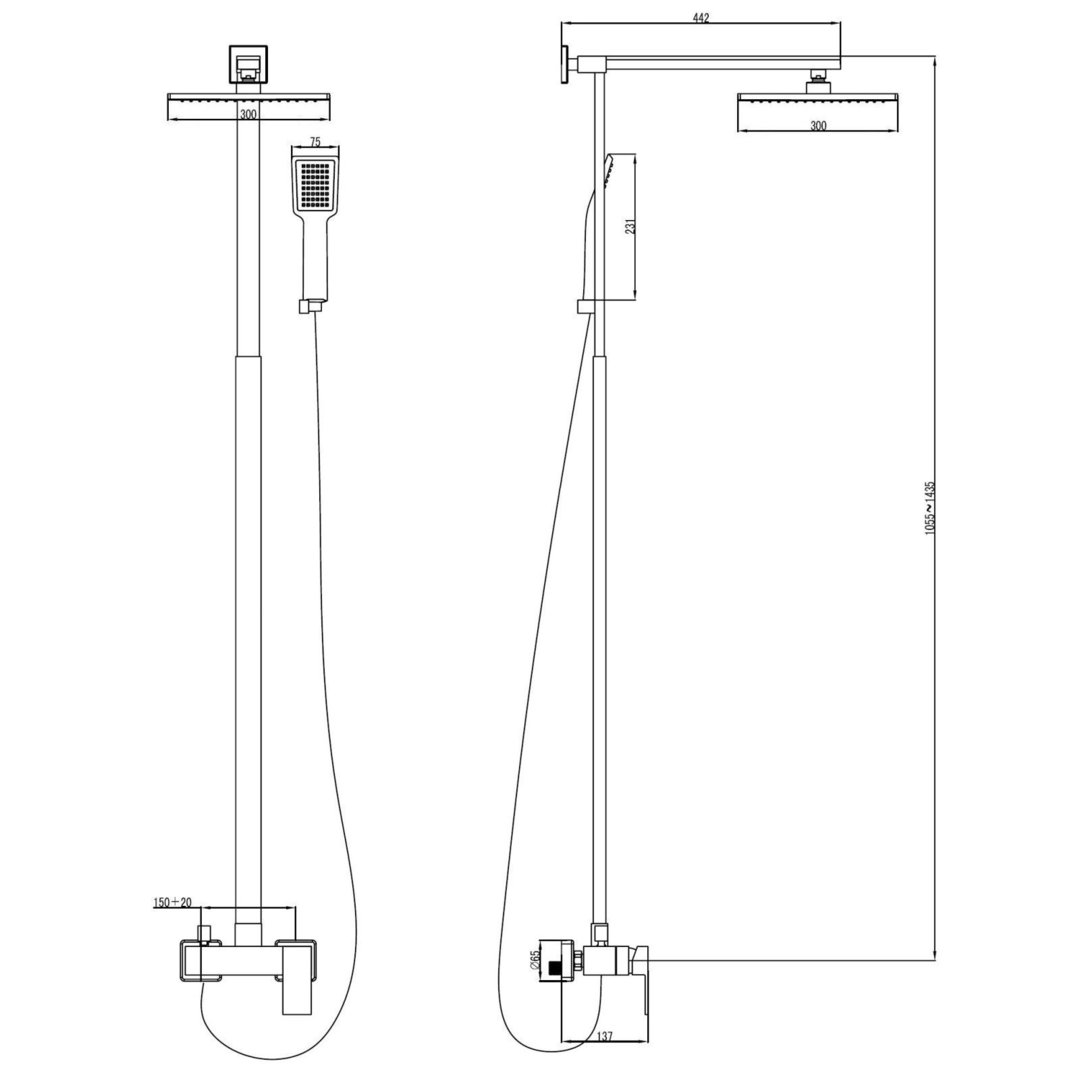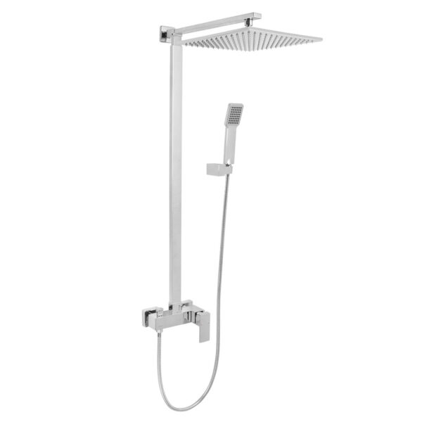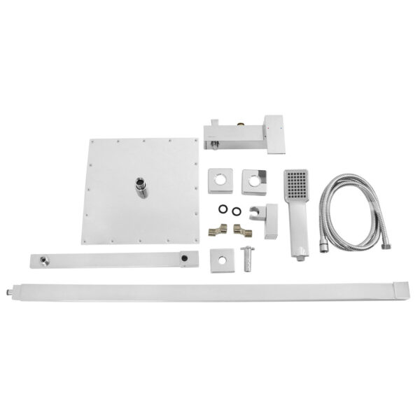 Lieferumfang: Duscharmatur, Regenbrausekopf, Rohrsystem, Handbrause, Brausehalterung, Brauseschlauch