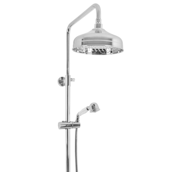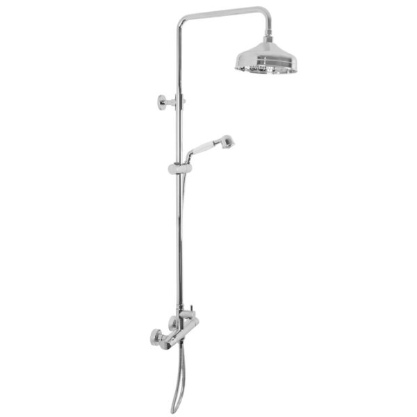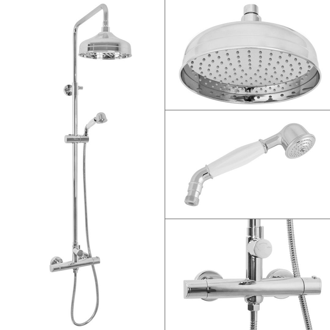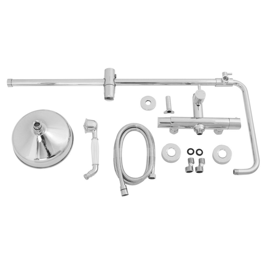 Lieferumfang: Thermostatduscharmatur, Regenbrausekopf, Rohrsystem, Handbrause, Brausehalterung, Brauseschlauch