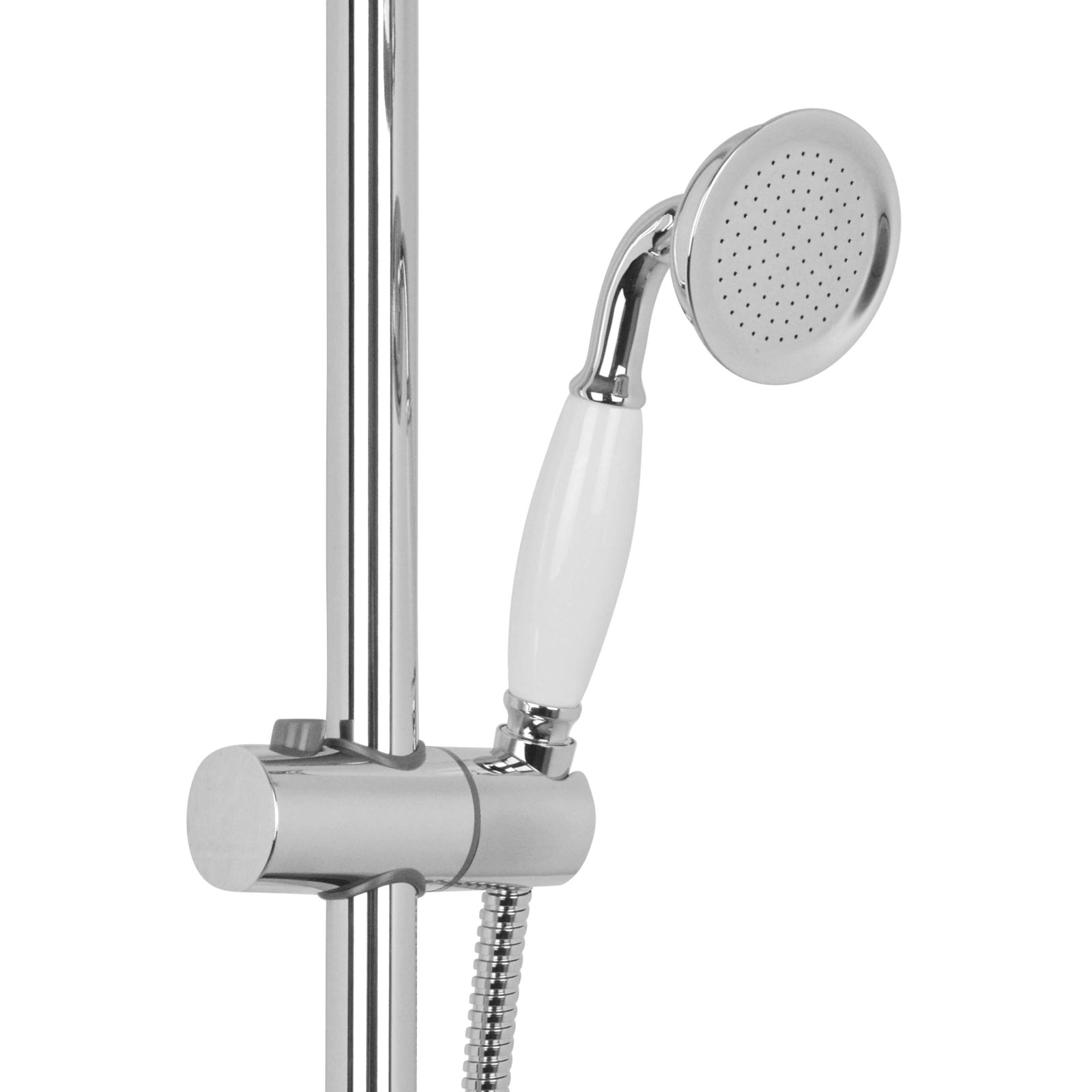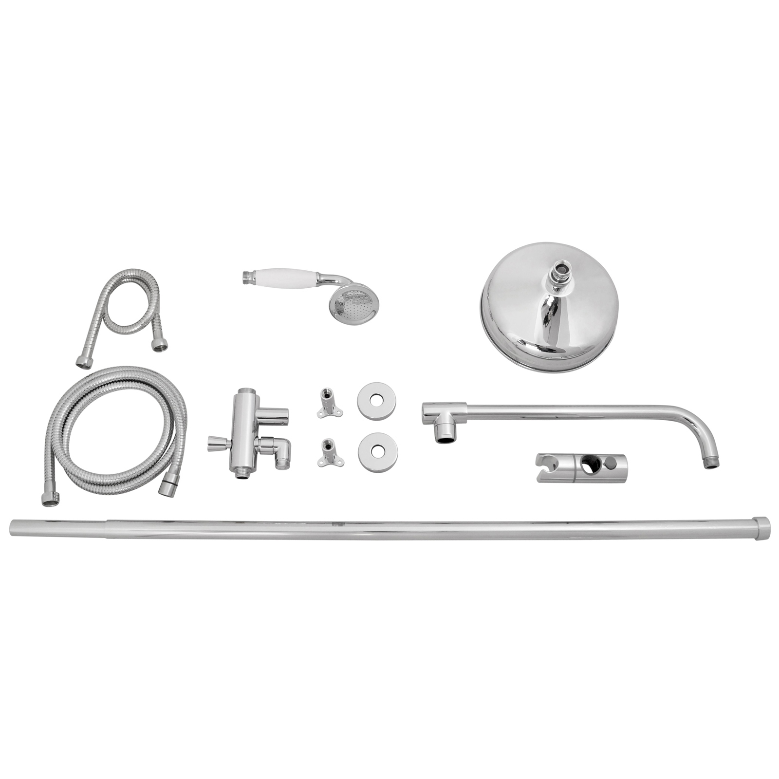 Eine Armatur ist nicht Bestanteil dieses Angebots. Die Rohre, die Wandhalterungen, die Handbrause, der Duschkopf und das Umstellelement sind aus Messing, verchromt und der Gleiter aus Kunststoff, verchromt.
