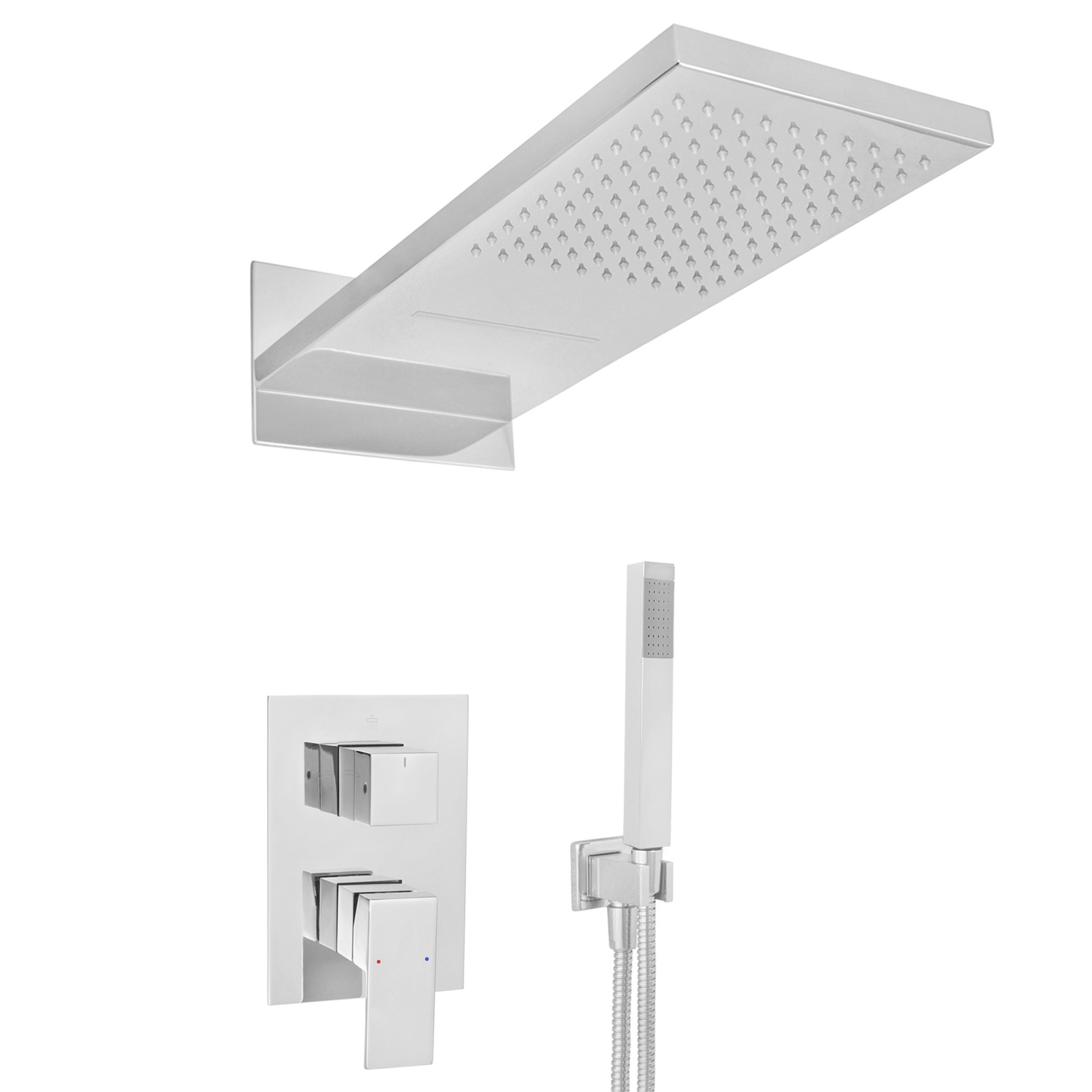 Lieferumfang: Unterputzarmatur, Wasserfall-Regenbrause, Handbrause, Wandanschlussbogen mit Brausehalterung, Brauseschlauch
