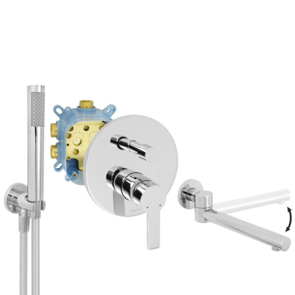 Lieferumfang: Unterputzarmatur inkl. Montagebox, schwenkbarer Wanneneinlauf, Handbrause, Wandanschlussbogen mit Brausehalterung, Brauseschlauch