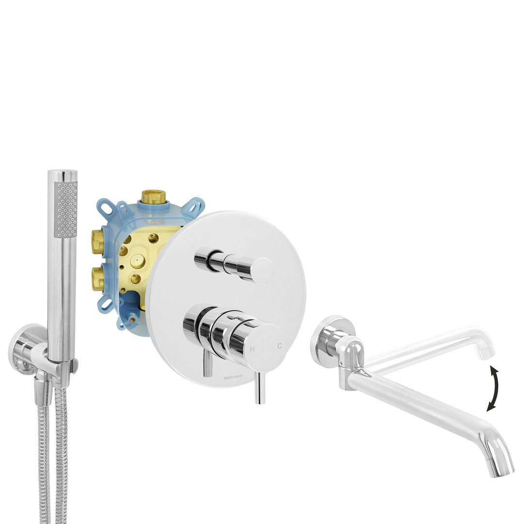 Lieferumfang: Unterputzarmatur inkl. Montagebox, schwenkbarer Wanneneinlauf, Handbrause, Wandanschlussbogen mit Brausehalterung, Brauseschlauch