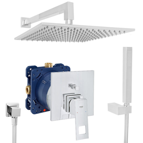 Lieferumfang: Grohe Armatur Eurocube 24062000, Grohe Unterputzeinheit Rapido SmartBox 35600000, Regenbrause 30x30cm, Zulaufarm, Handbrause, Brausehalterung, Wandanschlussbogen, Brauseschlauch