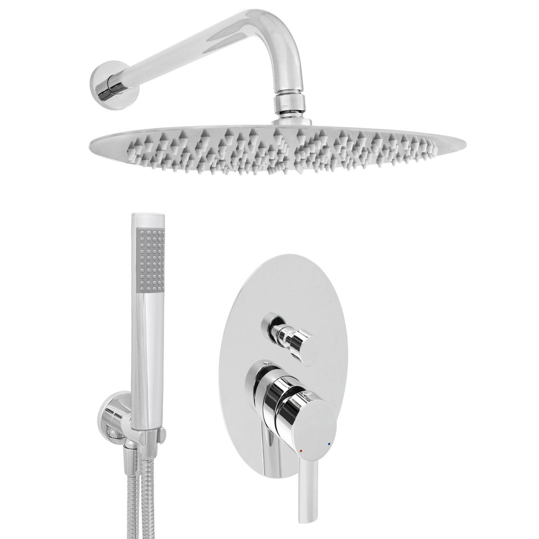 Lieferumfang: Unterputzarmatur, Regenbrause, Zulaufarm, Handbrause, Wandanschlussbogen mit Brausehalterung, Brauseschlauch