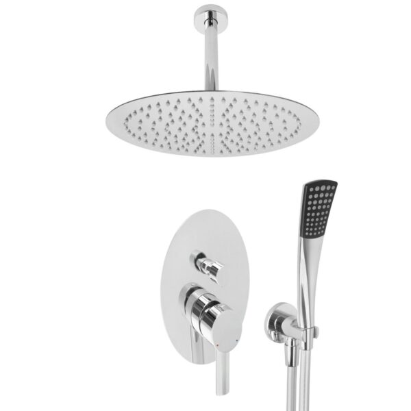 Lieferumfang: Unterputzarmatur, Regenbrause, Zulaufarm, Handbrause, Wandanschlussbogen mit Brausehalterung, Brauseschlauch