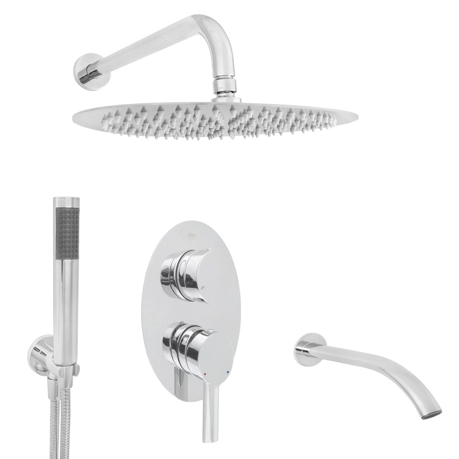 Lieferumfang: Unterputzarmatur, Regenbrause, Zulaufarm, Wanneneinlauf, Handbrause, Wandanschlussbogen mit Brausehalterung, Brauseschlauch