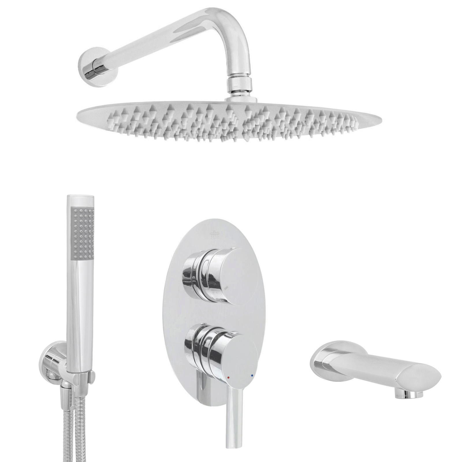 Lieferumfang: Unterputzarmatur, Regenbrause, Zulaufarm, Wanneneinlauf, Handbrause, Wandanschlussbogen mit Brausehalterung, Brauseschlauch