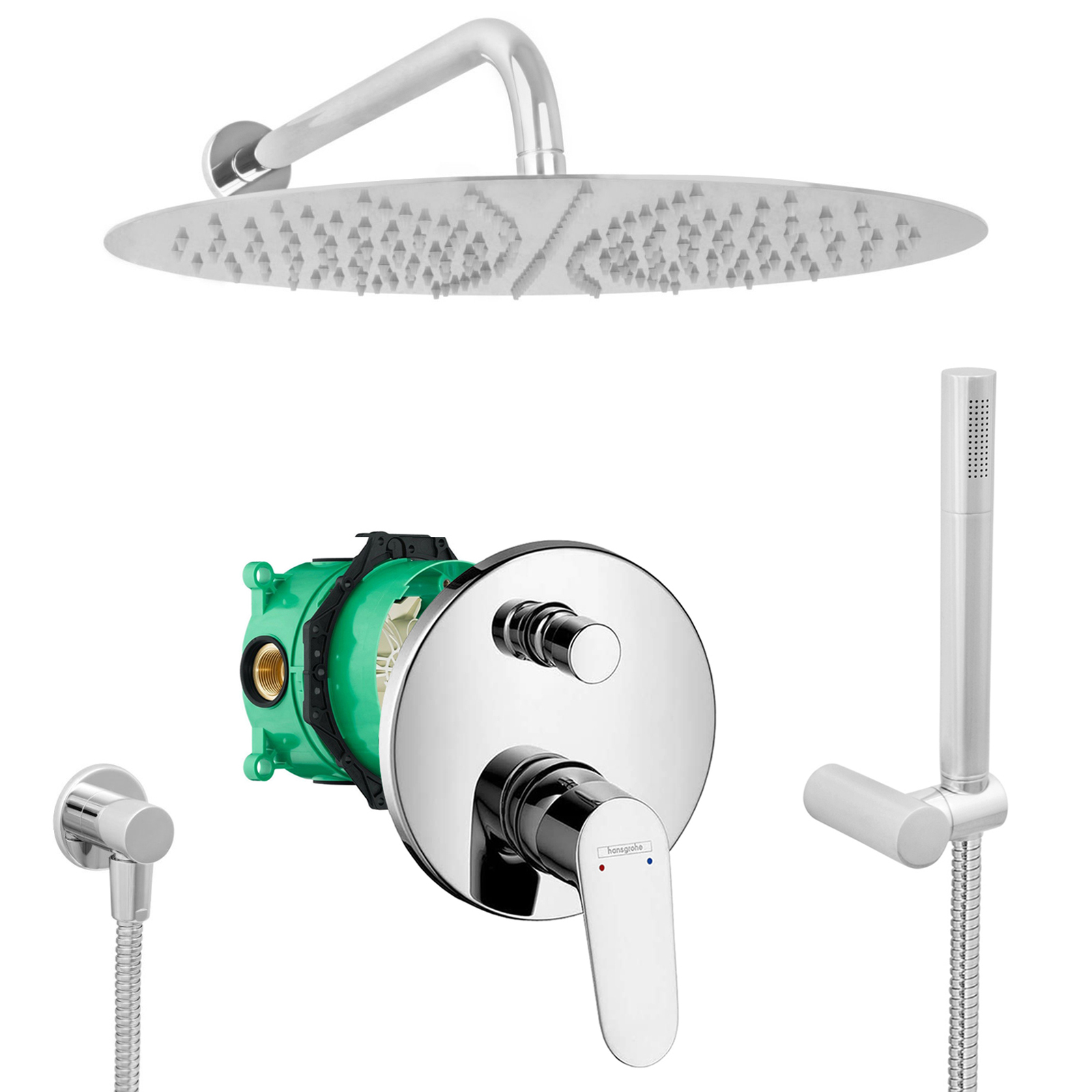 Lieferumfang: hansgrohe Armatur Focus 31945000, hansgrohe Grundkörper iBox 01800180, Regendusche 30cm, Zulaufarm, Stabhandbrause, Wandanschlussbogen, Halterung für Handbrausen, Brauseschlauch