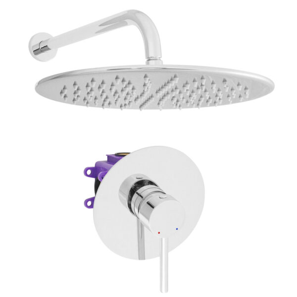 Lieferumfang: Unterputzarmatur mit Montagebox, Regenbrause aus Edelstahl mit 30cm Durchmesser und Zulaufarm 36cm lang