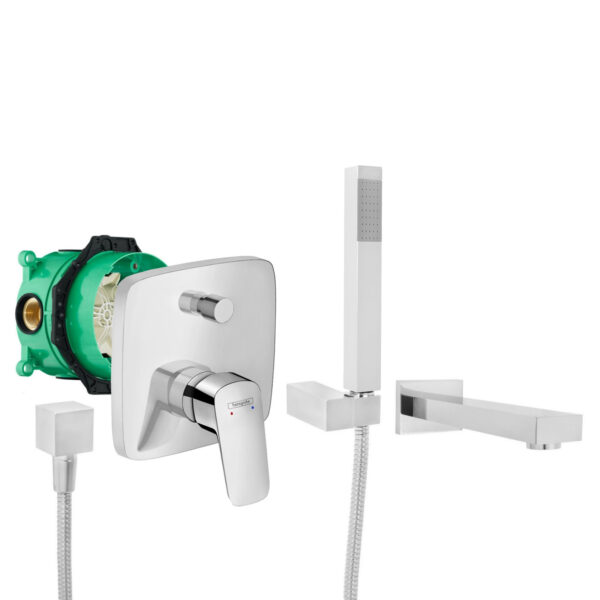 Lieferumfang: hansgrohe Armatur Logis 71405000, hansgrohe Grundkörper iBox 01800180, Wanneneinlauf, Handbrause, Brausehalterung, Wandanschlussbogen, Brauseschlauch