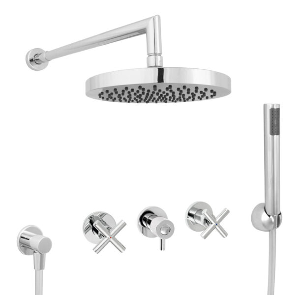 Lieferumfang: Unterputz-Armatur, Regenbrause, Zulaufarm, Brauseschlauch, Stabhandbrause, Halterung für Handbrausen, Wandanschlussbogen