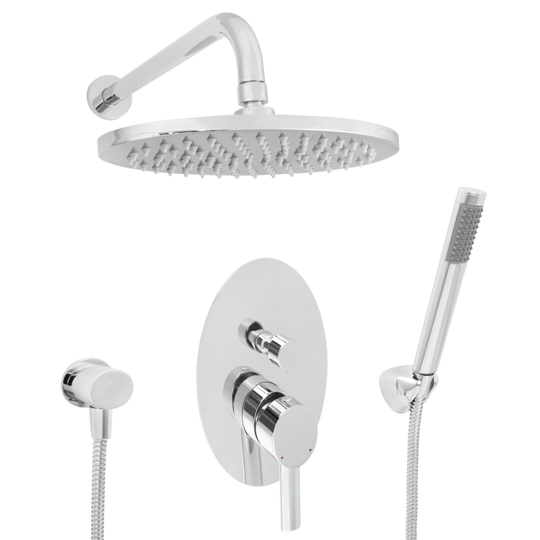 Lieferumfang: Unterputz-Armatur, Regenbrause, Zulaufarm, Stabhandbrause, Halterung für Handbrausen, Wandanschlussbogen, Brauseschlauch