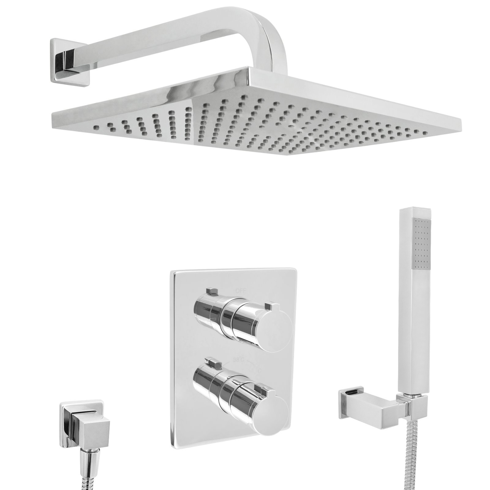 Lieferumfang: Thermostat-Unterputzarmatur, Regenbrause, Zulaufarm, Handbrause, Brausehalterung, Wandanschlussbogen, Brauseschlauch