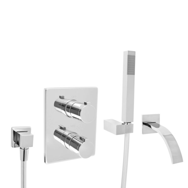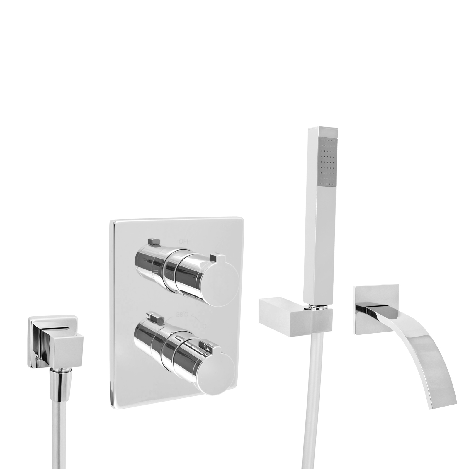 Lieferumfang: Thermostat-Unterputzarmatur, Wanneneinlauf, Stabhandbrause, Halterung für Handbrausen, Wandanschlussbogen, Brauseschlauch