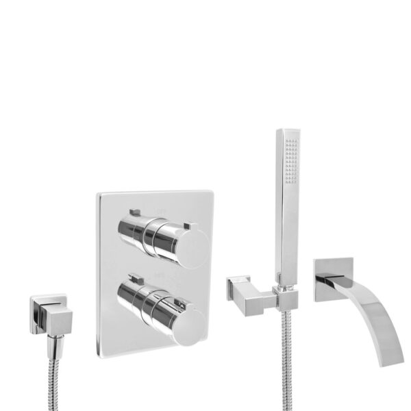 Lieferumfang: Thermostat-Unterputzarmatur, Wanneneinlauf, Stabhandbrause, Halterung für Handbrausen, Wandanschlussbogen, Brauseschlauch