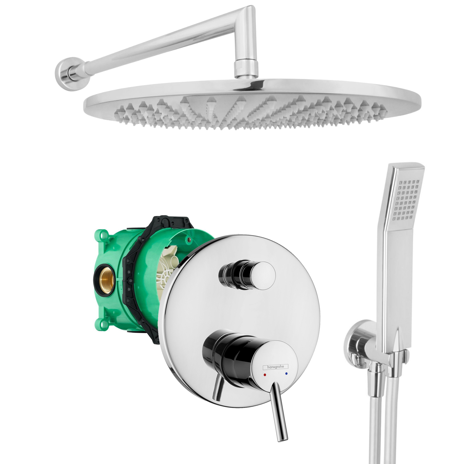 Lieferumfang: hansgrohe Armatur Talis S 32475000, hansgrohe Grundkörper iBox 01800180, Regendusche 30cm, Zulaufarm, Handbrause, Wandanschlussbogen mit integrierter Brausehalterung, Brauseschlauch