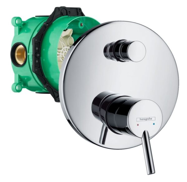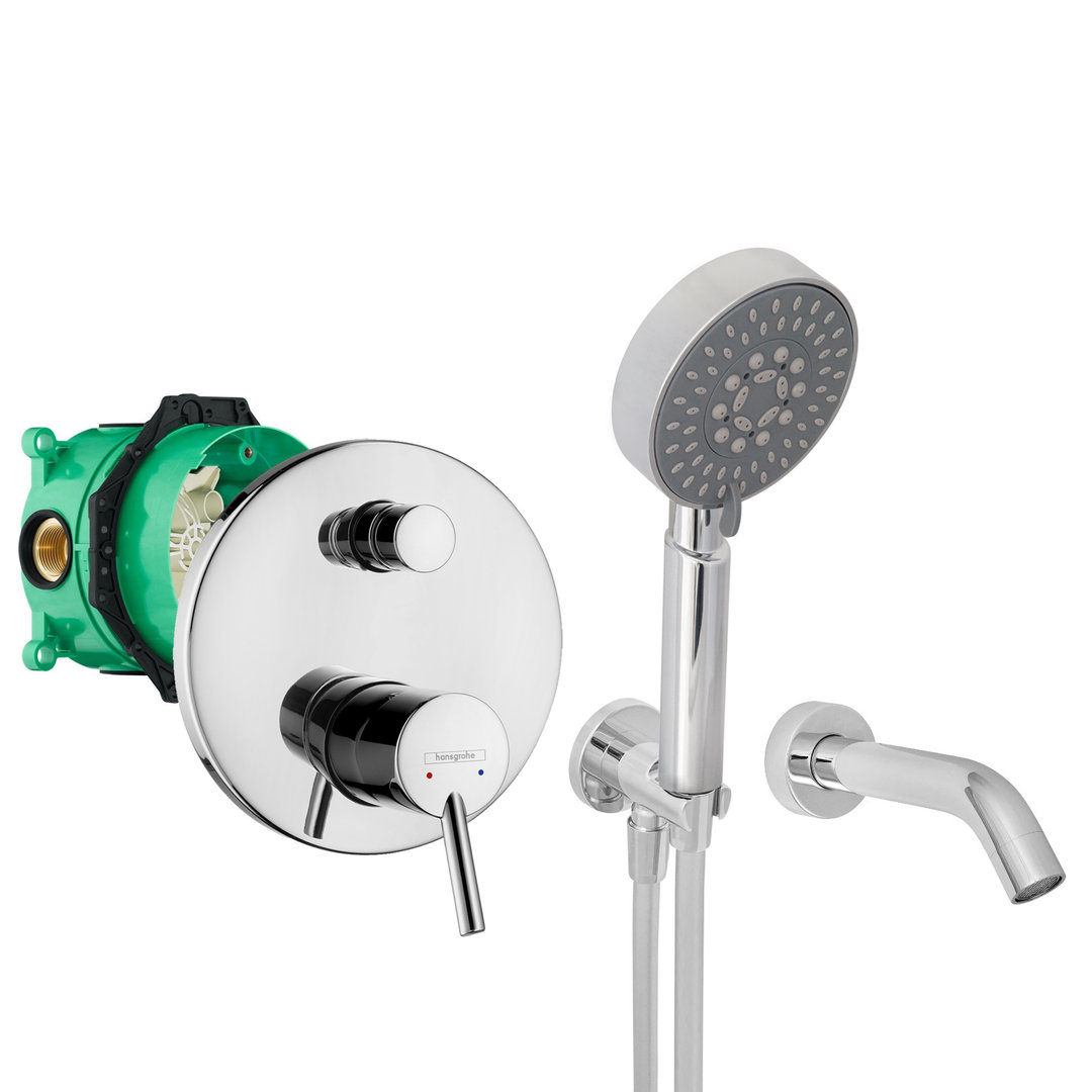 Lieferumfang: hansgrohe Armatur Talis S 32475000, hansgrohe Grundkörper iBox 01800180, Wanneneinlauf, Handbrause, Wandanschlussbogen mit integrierter Brausehalterung, Brauseschlauch
