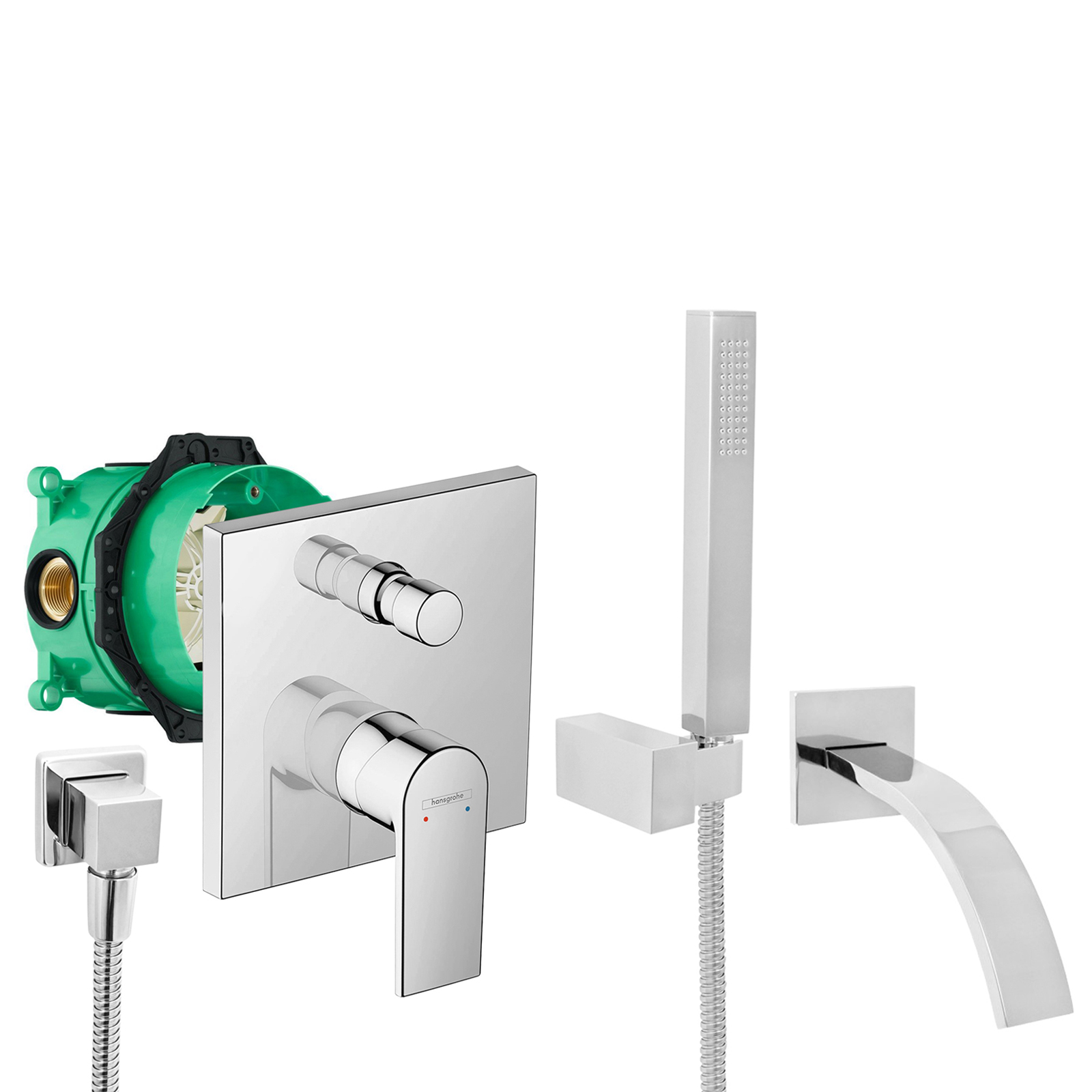 Lieferumfang: hansgrohe Armatur Vernis-Shape 71468000, hansgrohe Grundkörper iBox 01800180, Wanneneinlauf, Handbrause, Wandanschlussbogen, Brausehalterung, Brauseschlauch