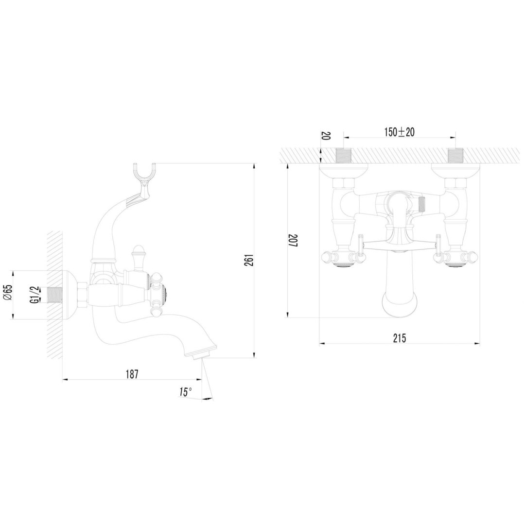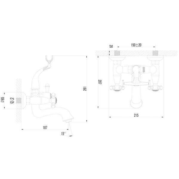 Aufputzarmatur für 15 cm Rohrabstand (gemessen Rohrmitte bis Rohrmitte – deutscher Standard)