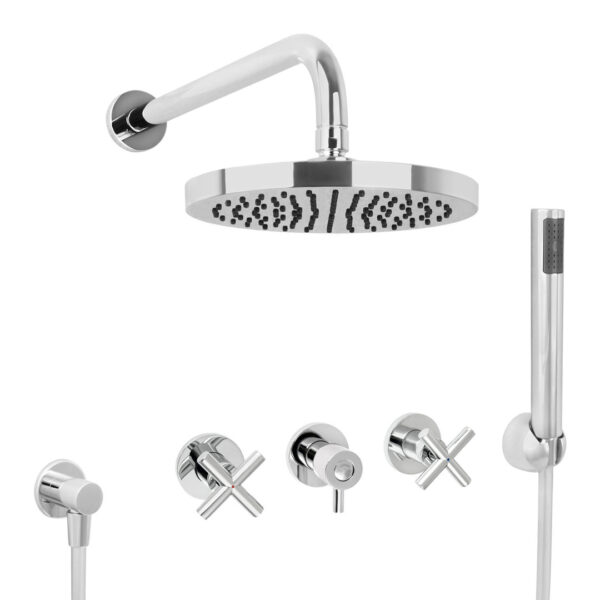 Lieferumfang: Unterputz-Armatur, Regenbrause, Zulaufarm, Brauseschlauch, Stabhandbrause, Halterung für Handbrausen, Wandanschlussbogen